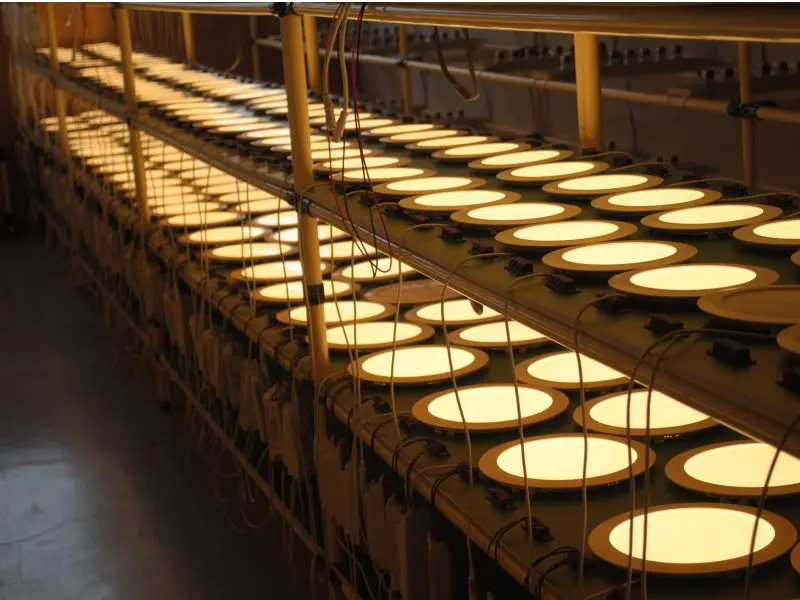 Start by introducing the different areas of the factory, such as the production lines, quality control stations, testing areas, and warehouses. Explain how these areas work together to manufacture LED lighting products, and give examples of the specialized equipment and technology used.